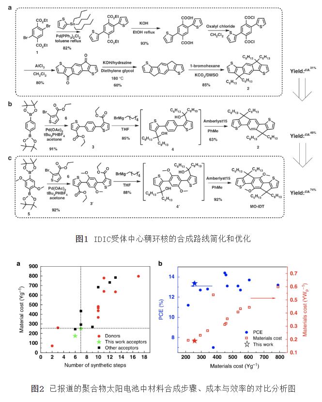 ? ? ? ?有機太陽能電池具有質輕、柔性、可溶液加工等優點,是當前太陽能電池技術的前沿熱點研究方向。隨著新型非富勒烯受體材料的快速發展,有機太陽能電池的能量轉換效率逐步提升,最近已突破16%,達到了可以向實際應用發展的階段。但是,實現有機太陽能電池的商業應用,還面臨著光伏材料成本和器件穩定性的挑戰。目前已報道的高效光伏材料大多存在著結構復雜、合成步驟繁多,產率低等問題,在成本上很難滿足商業應用的需求。因此開發低成本高效有機光伏材料是聚合物太陽能電池走向應用研究上的關鍵課題。