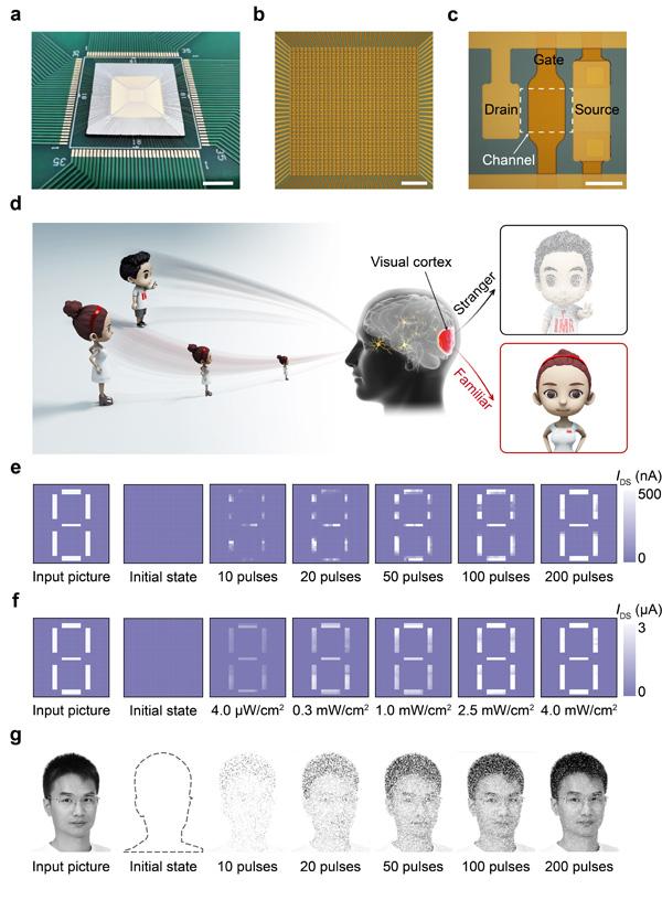 為了構筑高性能的神經形態視覺系統,必須首先獲得具有超高響應度、探測性和信噪比的光電傳感器。為了在極端昏暗的光線條件下實現增強的成像能力,科研人員設計并制備了一個1024像素的柔性光電傳感器陣列,使用半導體性碳納米管和鈣鈦礦量子點的組合作為神經形態視覺系統的有源敏感材料,集成了光傳感、信息存儲和數據預處理等功能,成功實現了視覺圖像強化學習過程。這兩類材料都具有優異的柔韌性、穩定性及工藝兼容等特點,通過材料組合為實現兼具生物體靈活性、復雜性和適應性的神經形態人工視覺傳感器提供了新策略。這也是第一次通過高集成度物理器件陣列方式,實現超弱光脈沖(1μW/cm2)響應,并完成神經形態強化學習的案例。與生物系統行為類似,光電傳感器、存儲元件和數據分析處理等組件在陣列中共享物理空間,并實時并行處理信息,這些結果對于試圖模仿生物視覺處理的人工視覺系統具有重要的啟發意義。?