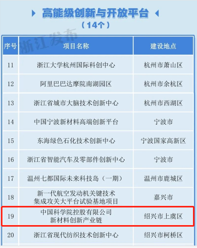 ? ? ? ?日前,浙江省政府辦公廳和省發展改革委分別印發《浙江省重大建設項目“十四五”規劃》和《浙江省重大建設項目“十四五”規劃項目表》,明確“十四五”期間安排重大建設項目245個(包括235個實施類項目和10個謀劃類項目),總投資82637億元。其中,由中科院新材料技術(浙江)有限公司運營的“中國科學院控股有限公司新材料創新產業鏈”名列其中。?